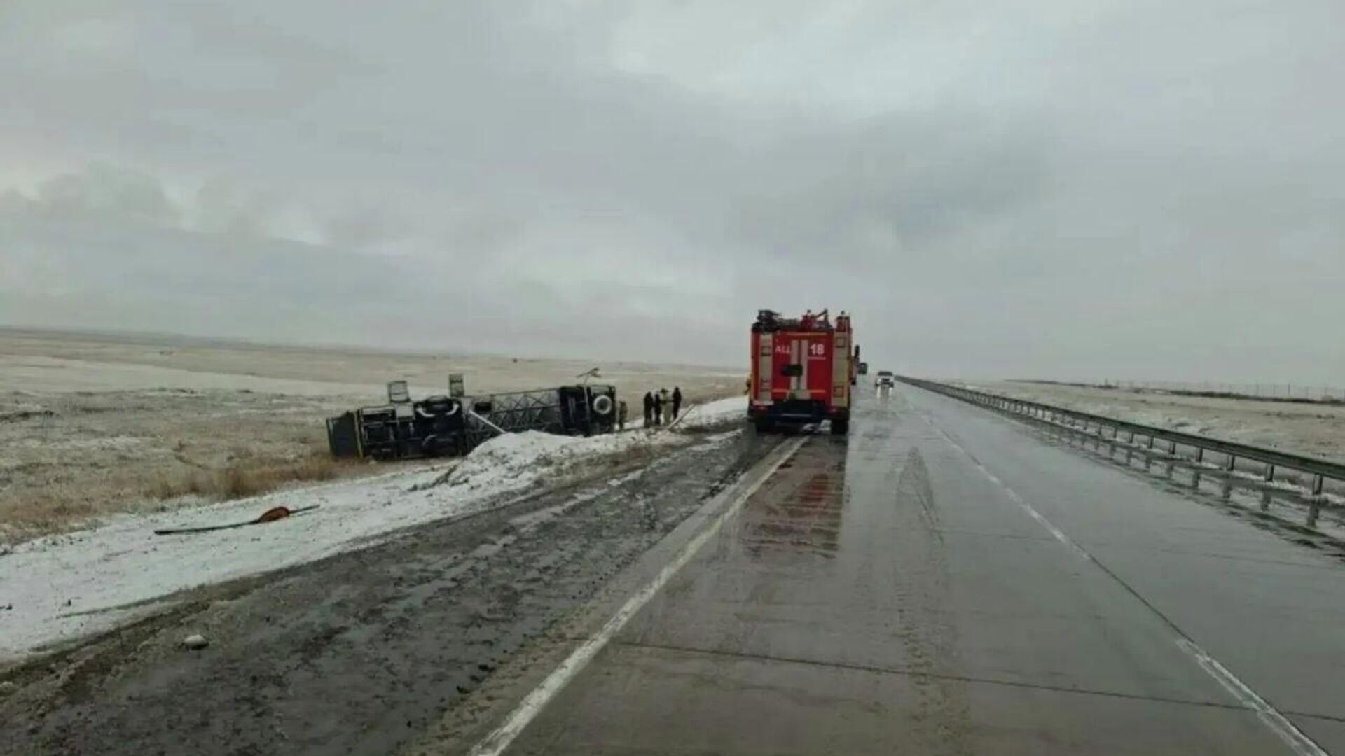 «Предположительно, из-за неблагоприятных погодных условий водитель автобуса потерял управление, после чего автобус съехал с дороги и перевернулся», — написал Осипов в своём Тelegram-канале, напомнив, что в регионе действует циклон: обильные осадки, понижение температуры, местами гололедица.