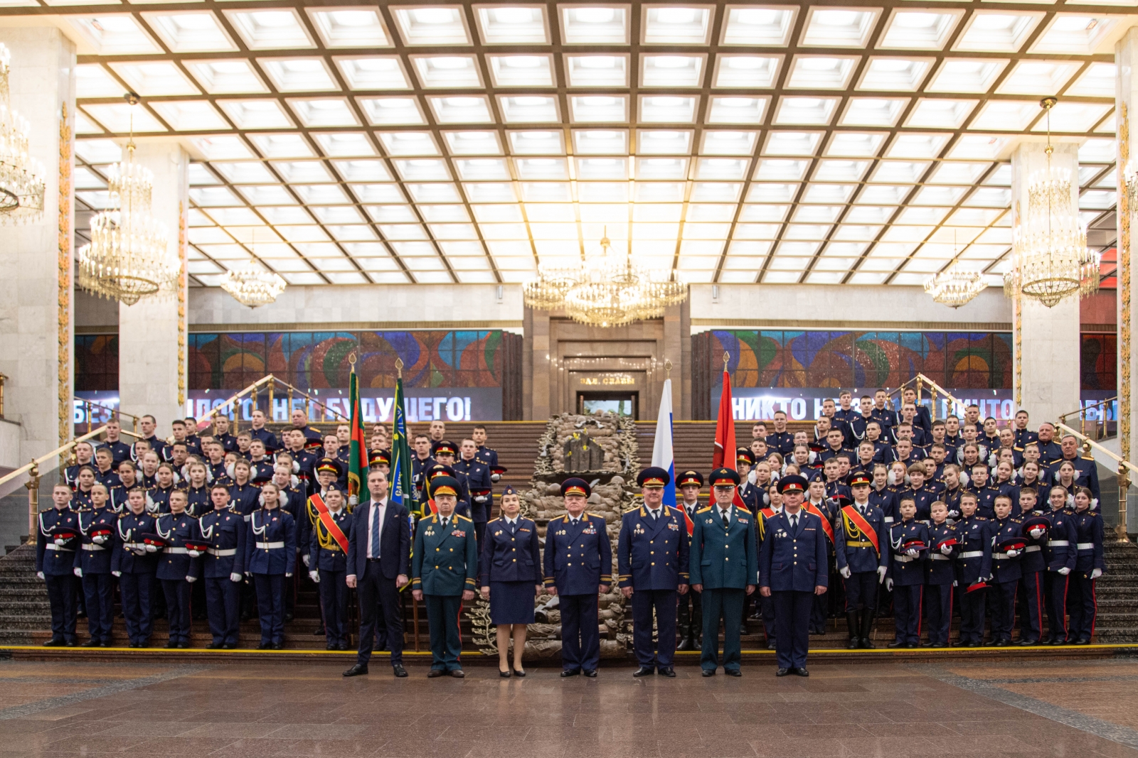 Мероприятие началось в Зале Памяти и Скорби, где после возложения цветов присутствующие почтили память павших воинов минутой молчания. С торжественной речью выступил С.В. Петров. Он поздравил кадет с этим важным моментом и пожелал им успехов в новом этапе служения Отечеству: «Сегодня вы вступили в огромнейшее кадетское братство. Я убежден, что вы с честью и гордостью пронесете звание кадета Следственного комитета Российской Федерации сквозь года».